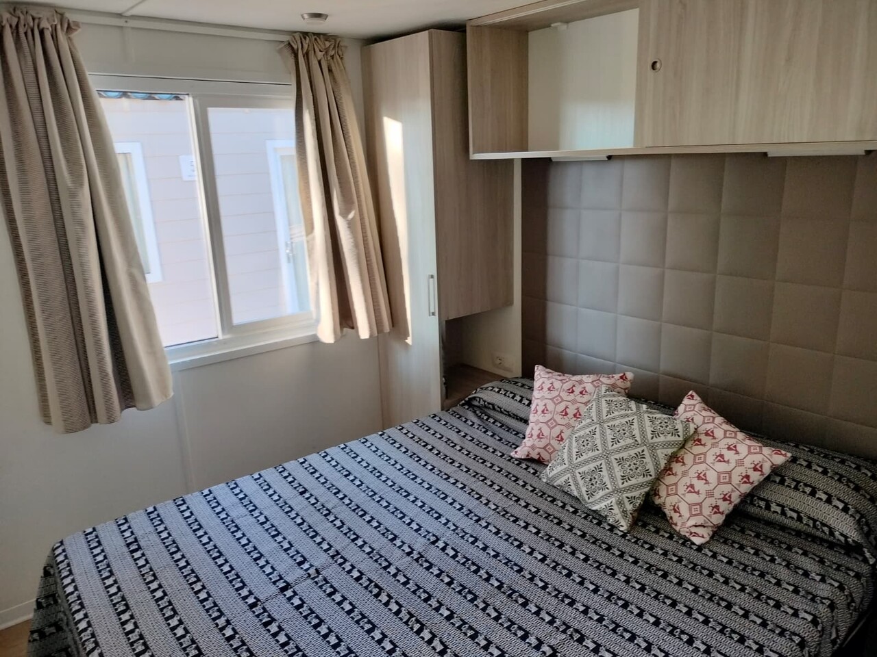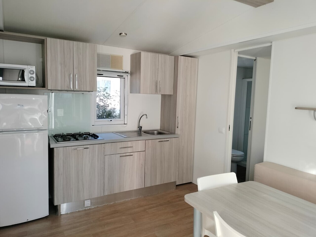 Accogliente mobile home offre tutto lo spazio di cui hai bisogno per rilassarti e divertirti. Due camere da letto, una matrimoniale e una con tre letti singoli, questa sistemazione ti permette di godere della natura circostante senza rinunciare ai comfort di un alloggio. Due bagni, una cucina-soggiorno completamente attrezzata, creano l'ambiente perfetto per trascorrere momenti indimenticabili.