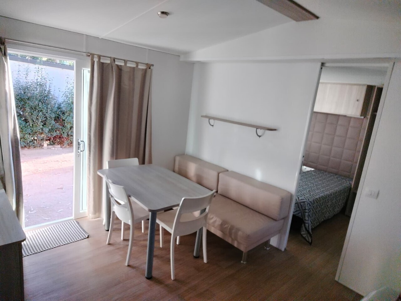 Mobile home STANDARD 2+3. Due camere da letto, una matrimoniale e una 3 letti singoli, ideale per due coppie o famiglie. Due camere con ambienti indipendenti e bagno personale ciascuna, cucina-soggiorno completamente attrezzata, soluzione per chi cerca un'equilibrio perfetto tra privacy e compagnia.